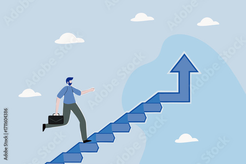 Vector illustration of groups of business people climbing up the mountain from both sides of it. Leader looking for future success on the top of rock. Teamwork, competition, leadership concept design.