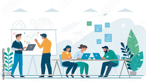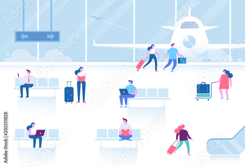 Vector illustration of business people at the airport. Businessmen with tablet, laptop sitting in waiting hall. Business trip, travel by plane concept design element in flat style.