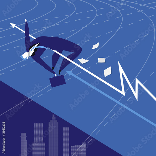 Vector illustration of businessman overcoming challenges like high jumper athlete. Business goal, success concept design element.