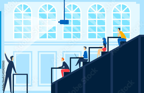 Vector illustration of businessman standing on career stairs in front of opened door. New opportunities and career growth in business concept flat style design.