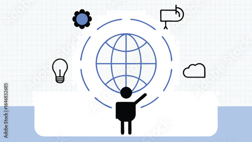 Vector illustration of businessman on human hand holding the Earth like greek mythology god Titan Atlas holds the world on his shoulders. Business concept design element in flat style.