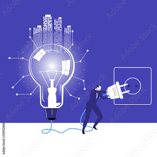 Vector illustration of businessman trying to switch on idea bulb. Business vision, new ideas concept design element.