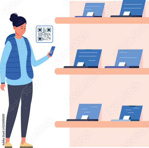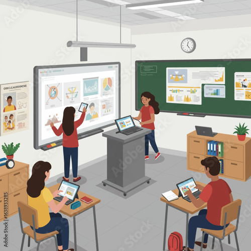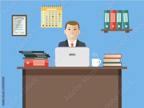 Vector illustration of businessman with briefcase using smartphone. Modern office workspace interior. Flat style design.
