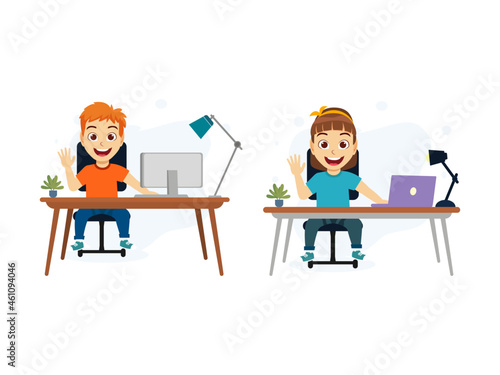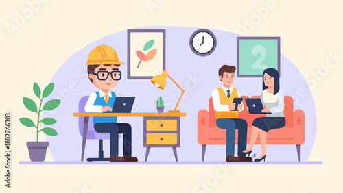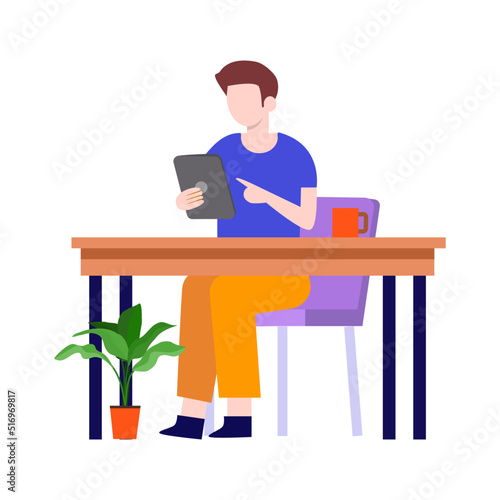 Vector illustration of cafe design element with visitor having lunch. Young man with mobile is sitting at the table. Cafe interior and cartoon character in flat design.