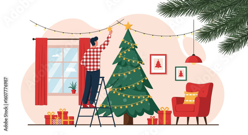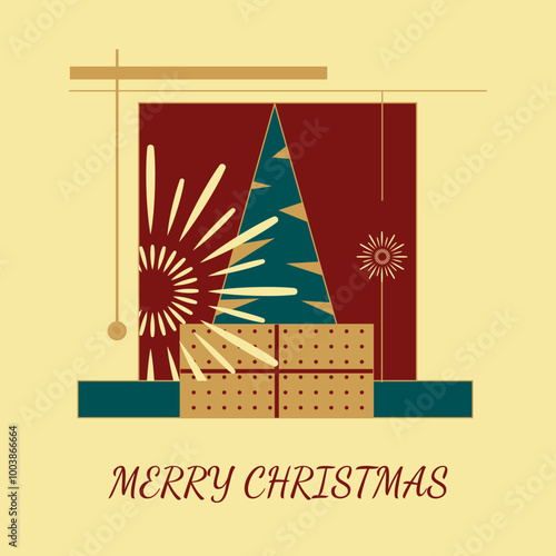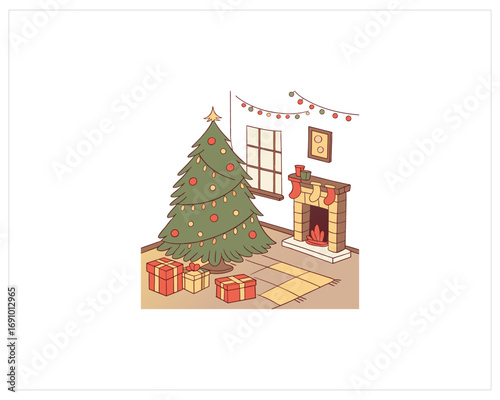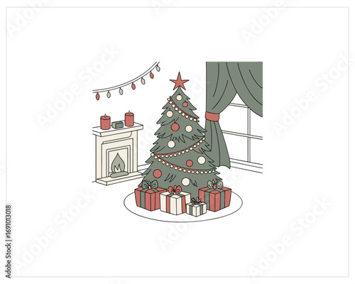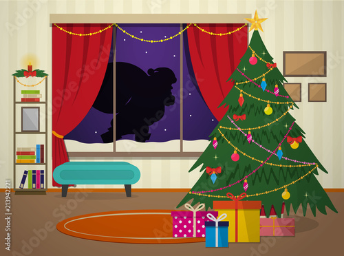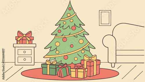 Vector illustration of christmas tree decorated with baubles, lights. Gifts under the tree. Cat touching tree with paw. Home interior. Merry Christmas and Happy New Year design element in flat style