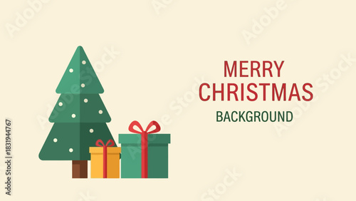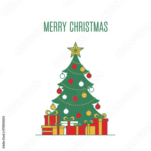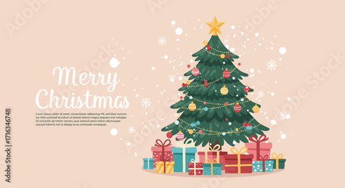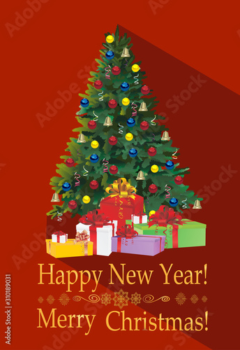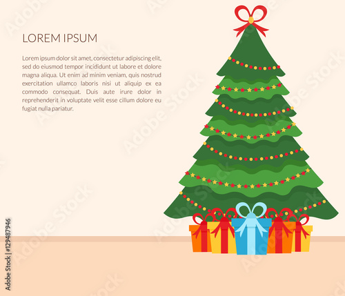 Vector illustration of christmas tree decorated with baubles and lights. Gifts under the tree. Home interior. Merry Christmas and Happy New Year design element in flat style.