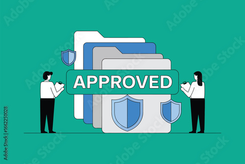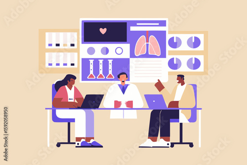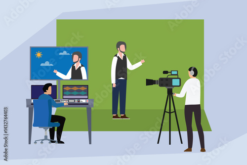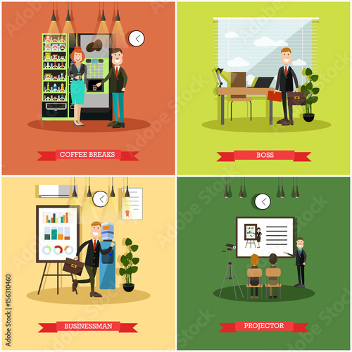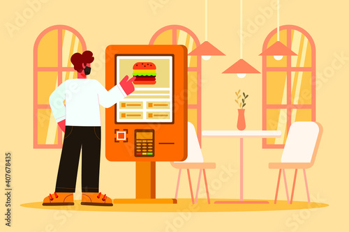 Vector illustration of coffee house design template with barista and visitor. Customer standing near bar counter. Coffee house interior in flat style.