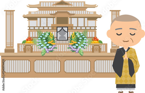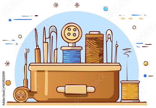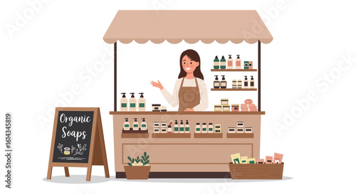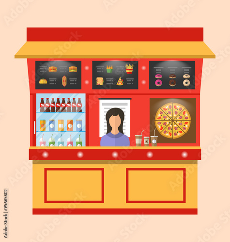 Vector illustration of coffee shop design element with barista standing behind of bar counter, coffee making equipment, utensils, menu. Coffee shop interior and cartoon character in flat design.