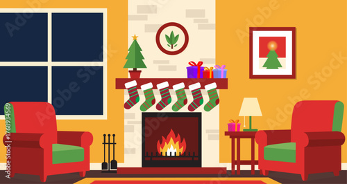 Vector illustration of cozy fireplace decorated with christmas stockings, fir trees branches. Living room interior. Merry Christmas and Happy New Year design element in flat style.