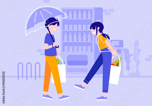 Vector illustration of fashion mens store interior in flat style. Man is going to do shopping. Mannequin in casual clothes.