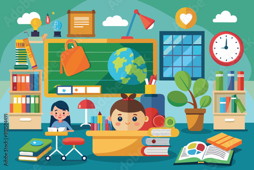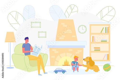 Vector illustration of little girl sitting on carpet and playing with her dog in children room. Pet animal. Nursery interior and cartoon characters in flat design.