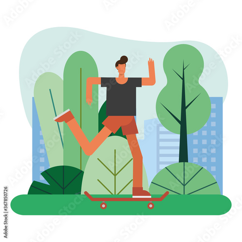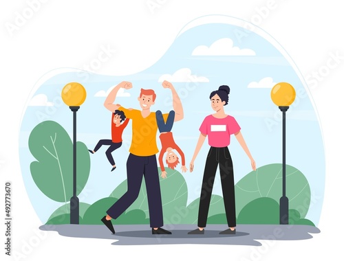 Vector illustration of happy father meeting with flowers his lovely wife holding newborn baby. Maternity hospital, baby birth flat style design element.