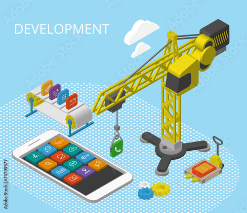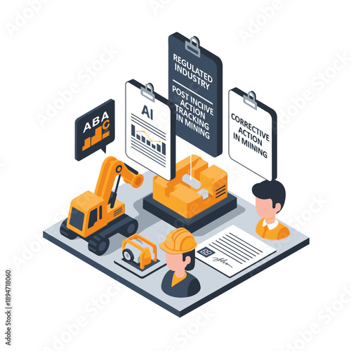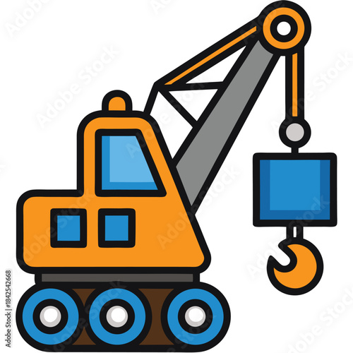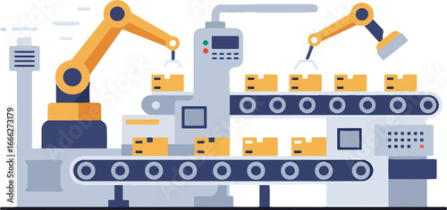 Vector illustration of industrial robot for palletizing food products. Cardboard boxes on pallet, conveyor belt. Factory automation concept design element in flat style.