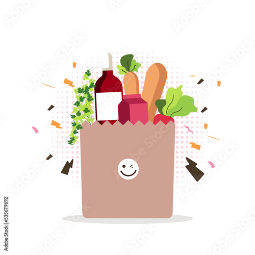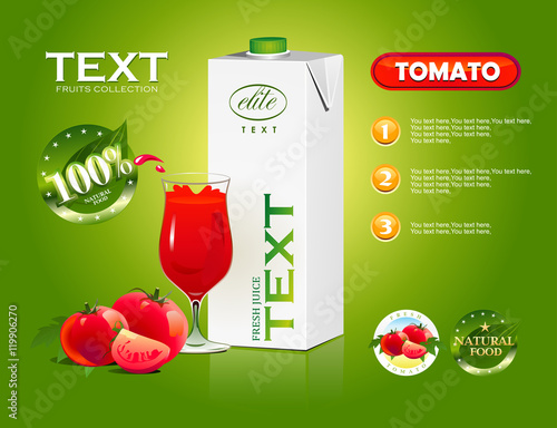 Vector illustration of juice carton, glass full of tomato juice and fresh ripe tomato and tomato slices. Popular nonalcoholic beverage with refreshing sour, salty, sweet taste. Flat design