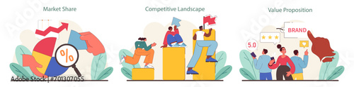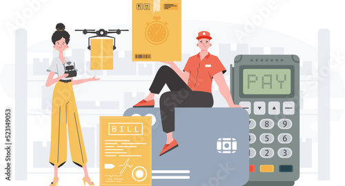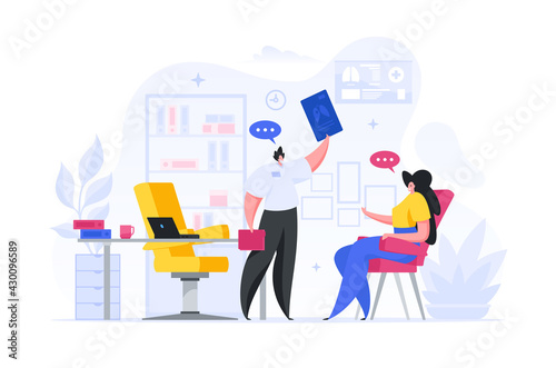 Fast food concept vector illustration in flat style. Man serving visitors young man and woman. Fast food restaurant interior.