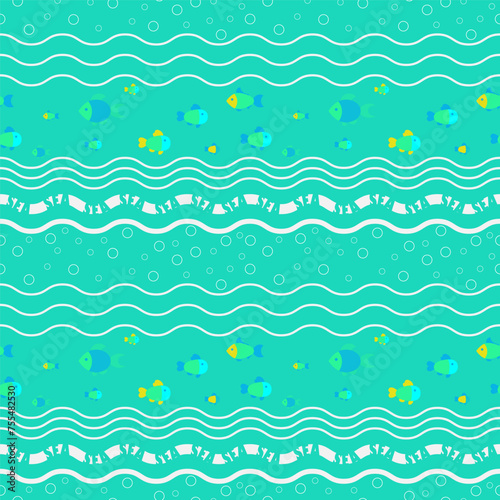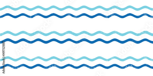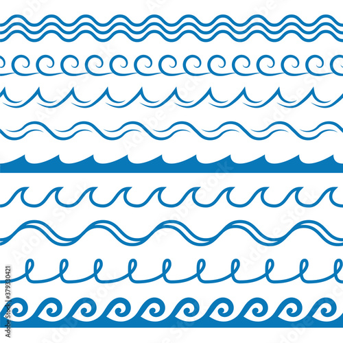 Vector illustration of ocean and sea waves, surfs and splashes. Seamless isolated design elements on white background. Blue marine patterns.