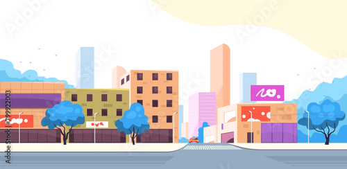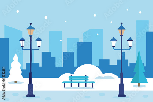 Vector illustration of people skating at ice rink. Cartoon characters, cityscape. Winter sports and activities concept design element in flat style.