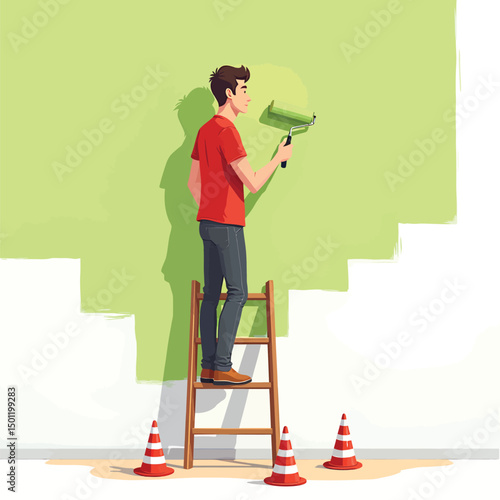 Vector illustration of worker puttying wall. Plasterer profession, building and repairing a house concept vector illustration in flat style.