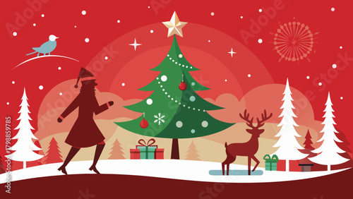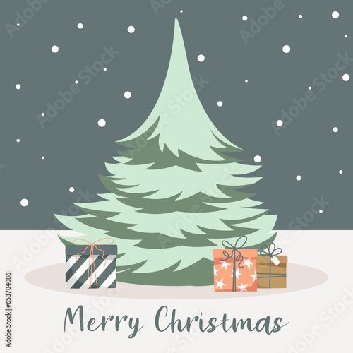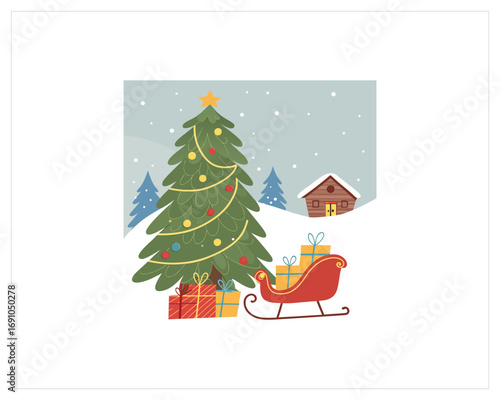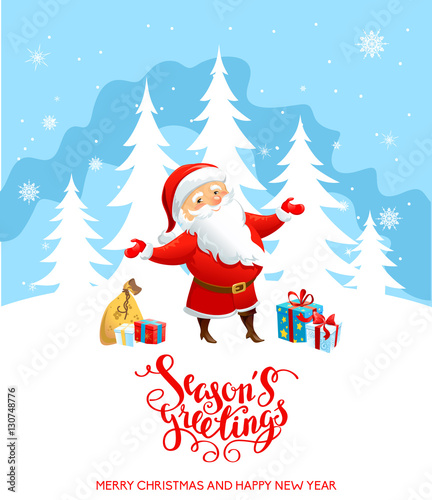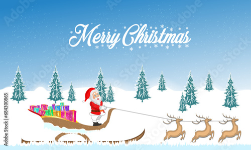 Vector illustration of Santa Claus riding sleigh. It is snowing. Winter landscape. Cartoon characters. Merry Christmas and Happy New Year design element in flat style.