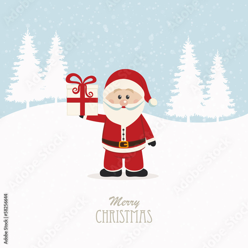 Vector illustration of Santa Claus with sack full of presents. It is snowing. Winter cityscape. Cartoon character. Merry Christmas and Happy New Year design element in flat style.