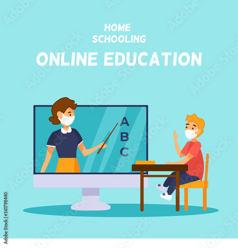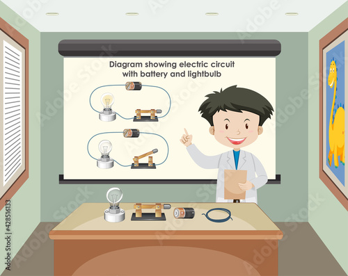 Vector illustration of scientist male looking through microscope, investigating objects. Laboratory interior and equipment design element in flat style.