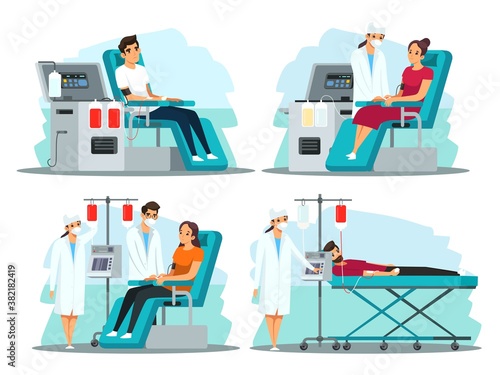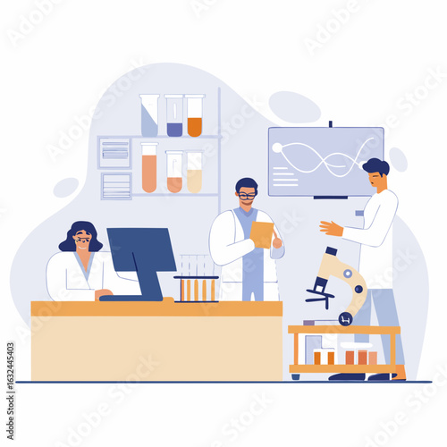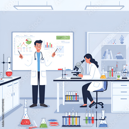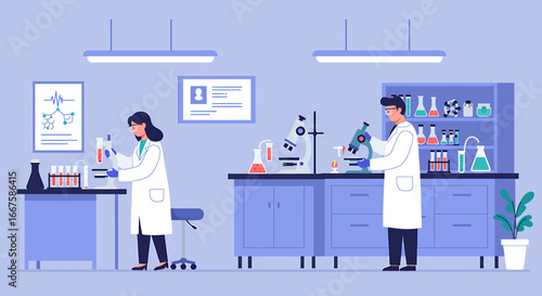 Vector illustration of scientists man and woman working at science lab. Laboratory interior, equipment and lab glassware. Chemistry education. Scientific research concept flat style design element.