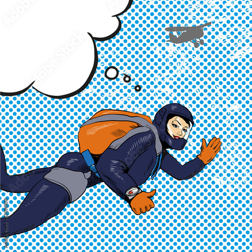 Vector illustration of skydiving woman in retro pop art comic style. Hand up and thumb up hand signs. Speech bubble.
