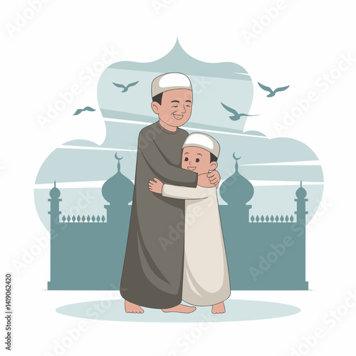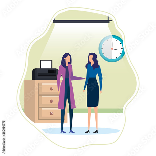 Smorgasbord concept vector illustration in flat style. Visitors man and woman standing near table with burgers, bakery and desserts. Restaurant interior.
