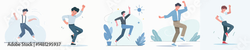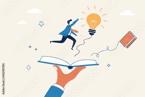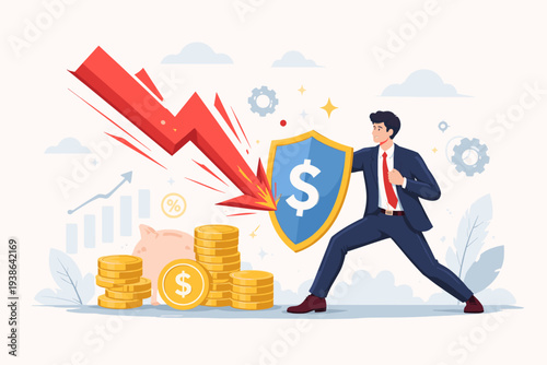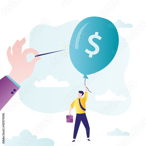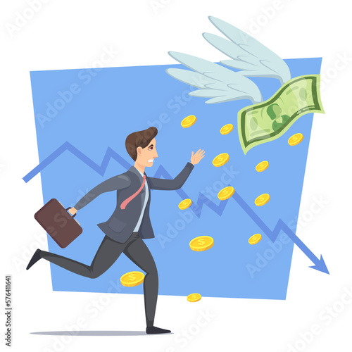 Vector illustration of forefinger pointing at successful businessman standing on the top of money stairs. He is holding cup in his hands. Business success concept design element in flat style