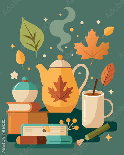 Vector illustration of modern glass teapot with freshly brewed tea, cup of hot, flavour tea and fresh, ripe lemon with slices. Popular drink for morning. Flat design