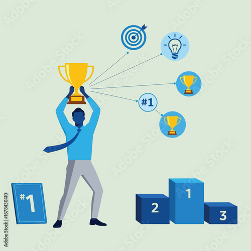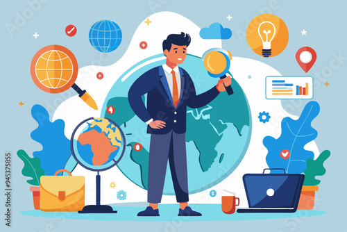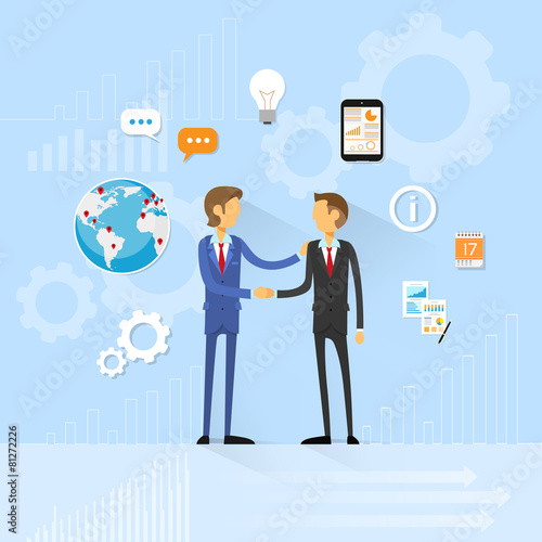Vector illustration of two businessmen talking to each other and business flat icons, infographic items around them.