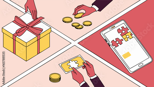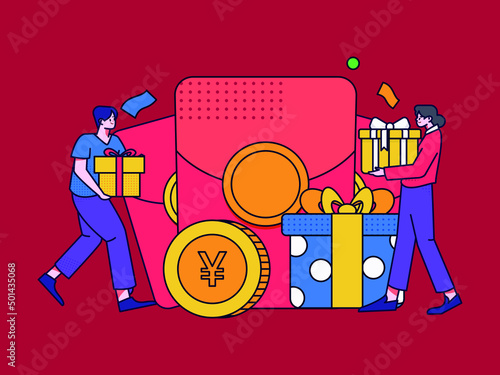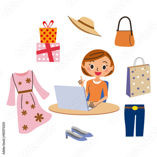 Vector illustration of young woman and gift boxes around her, pop art style in retro pop art comic style.
