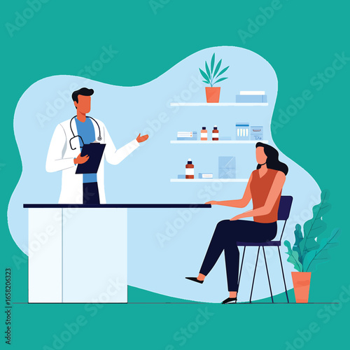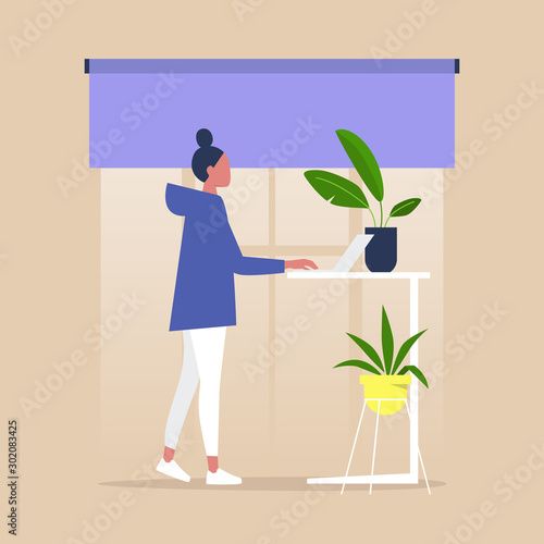 Physics research concept vector illustration in flat style. Physicist woman carrying out experiment. laboratory interior, glassware and equipment.