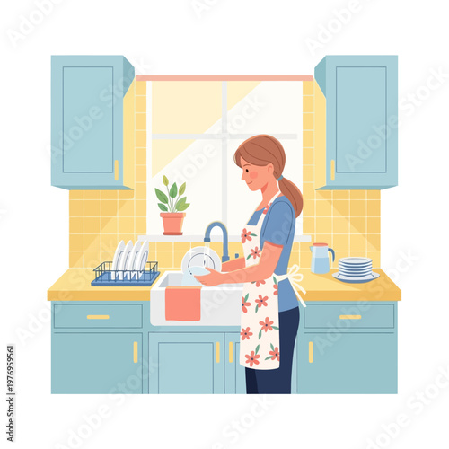 Vector illustration of young woman cooking salad, slicing cucumber. Kitchenware and furniture. Kitchen interior and cartoon character in flat design.