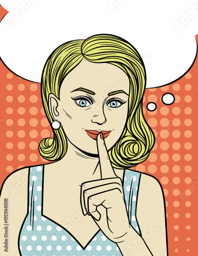 Vector illustration of woman showing his left hand with manicure and holding red nail polish in right hand. Retro pop art comic style. Speech bubble.