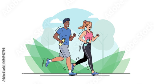 Vector illustration of young couple walking in the street. Girl and boy holding hands. Winter cityscape, snowy street, trees. Winter people activities concept design elements in flat style.