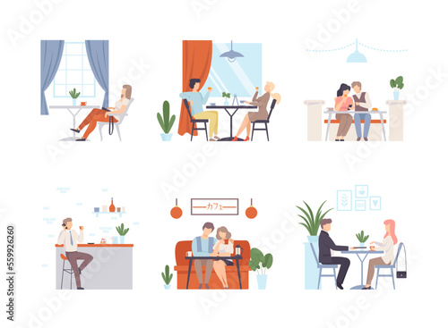 Vector illustration set of people cooking food at home. Man and woman cartoon characters eat and cook at home kitchen. Chef, kitchen table, breakfast.