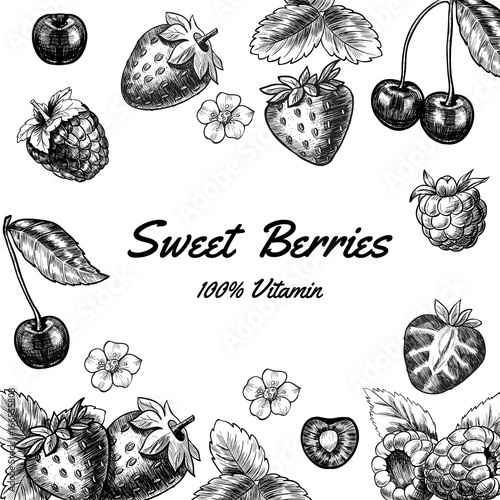 Vector ink hand drawn style berry set. Strawberry, cherry, blueberry, sea buckthorn, raspberry vintage sketch illustration for recipe, menu, print.