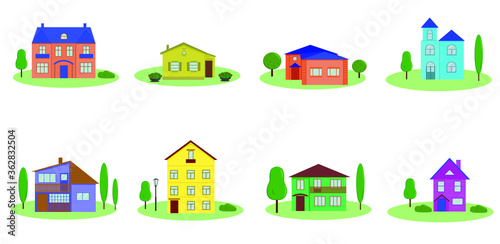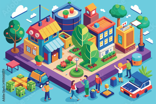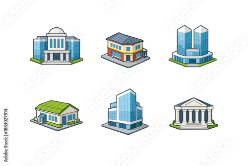 City shop building icon set. Vector isometric illustration of different shops isolated on white background. Pet music book flower and hardware store buildings exterior view.