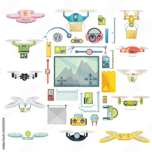 Isometric drone poster, banner template set. Vector illustration of controlled via smartphone or controller quadcopters delivering parcel, first aid kit.