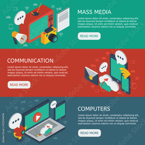 Vector isometric horizontal banner set with medical, household, hotel and restaurant service robots helping or serving people and copy space.