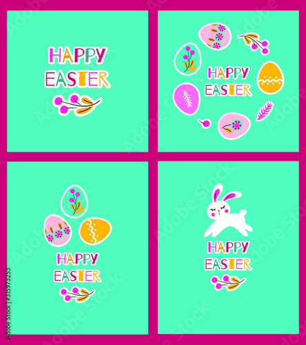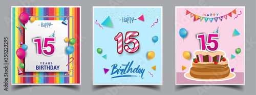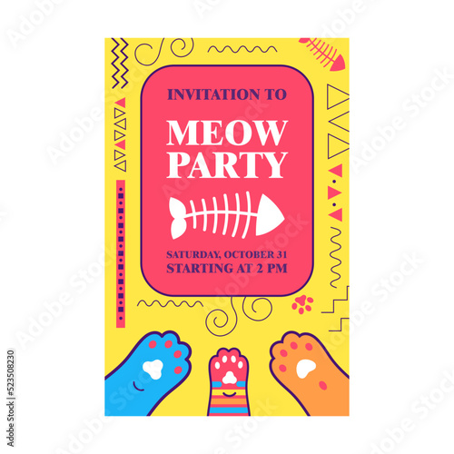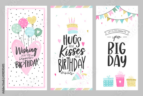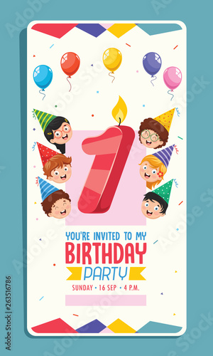 Kids birthday party invitation card vector template with hand drawn funny and cute characters, sweets, cake, gift boxes, party decorations and hand lettering.