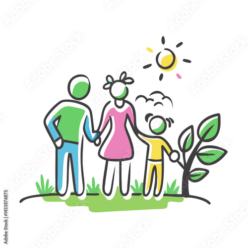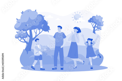 Vector layered paper cut style happy family walking in city park. Father, mother with two kids holding hands enjoying outdoor walking together. Happy family weekend concept for poster, banner etc.