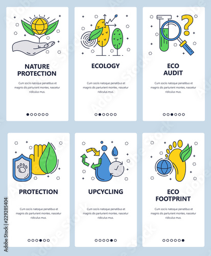 Vector set of mobile app onboarding screens. Resources consumption, Power management, Energy efficiency, Low carbon, Green energy web templates and banners. Thin line art flat icons for website menu.