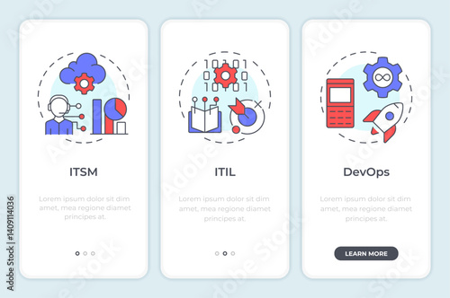Vector set of mobile app onboarding screens. Security, Profile, Workplace, Global Management, Strategy, Business web templates and banners. Thin line art style design icons for website menu.