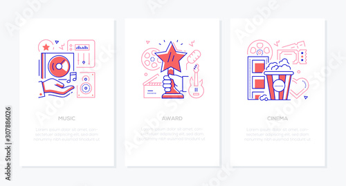 Vector set of mobile app onboarding screens. Global Business, Archive, Documents, Mail, Videotube, Education web templates and banners. Thin line art style design icons for website menu.