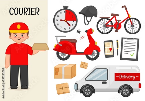 Vector Logistics delivery, transportation, warehouse concept infographic items, icons. Delivery by plane, ship, truck, scooter, removal of goods from warehouse by loader design elements in flat style.