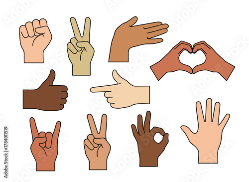 Vector male hand gesture icon set. Victory or peace sign, clenched fist, pointing finger, okay and other hand signs.