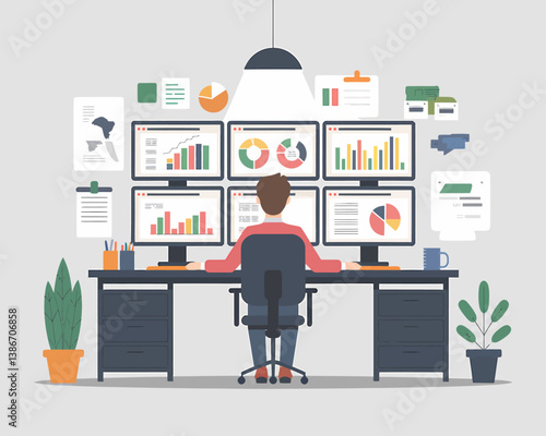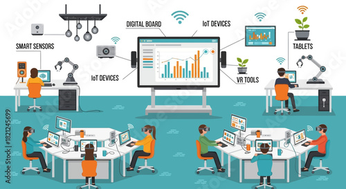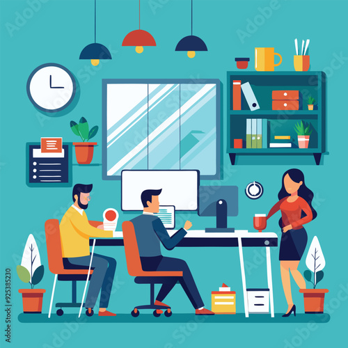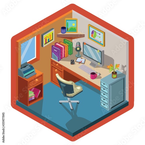Vector set of modern workspace interiors with office furniture and equipment. Office life of business people, flat style illustration.