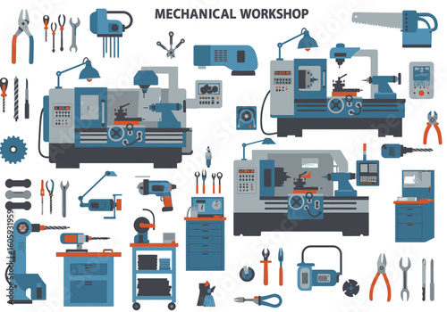 Vector set of modern workspace interiors with office furniture and equipment. Office workers in break room, office cabinet, reception hall, flat style illustration.